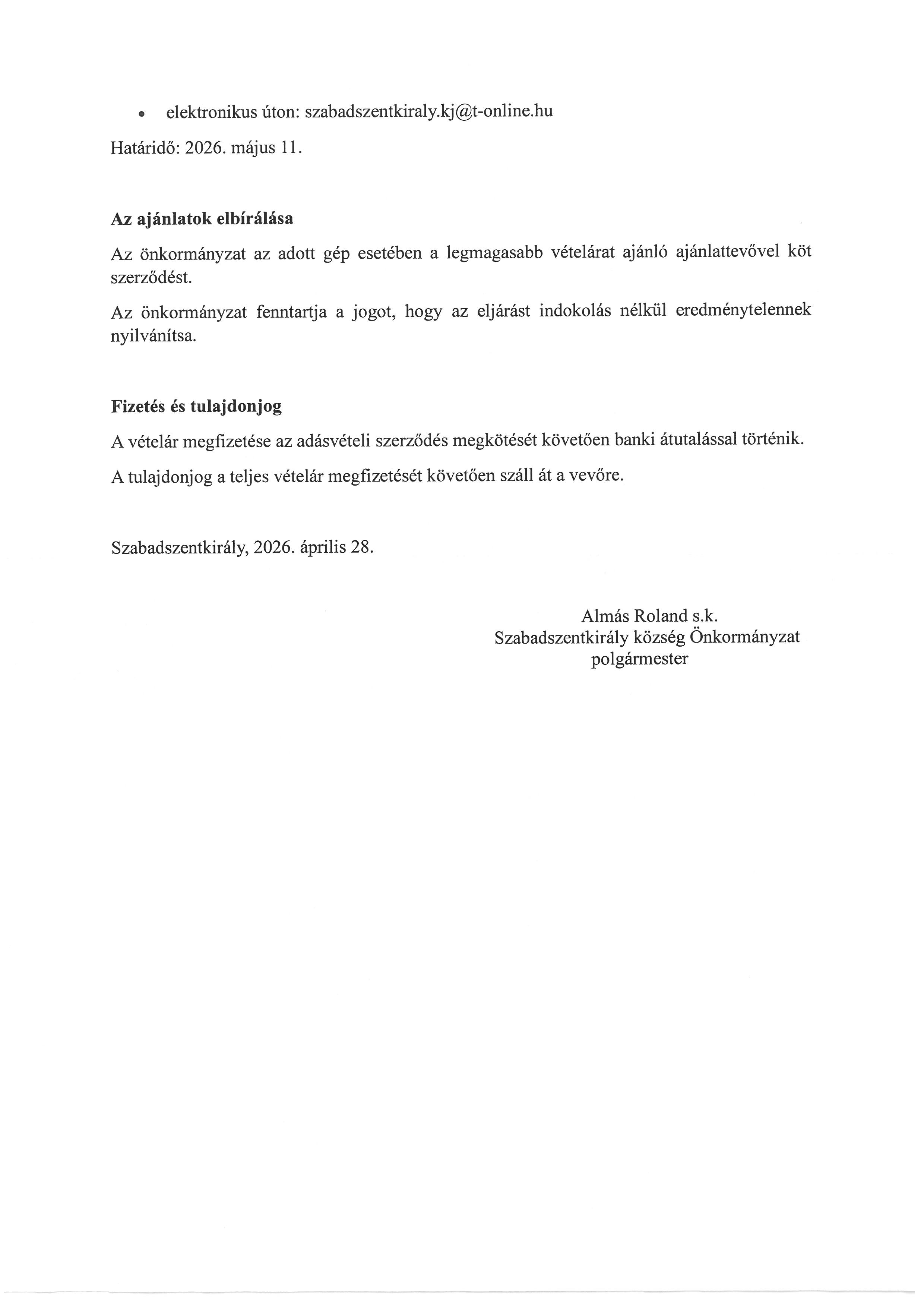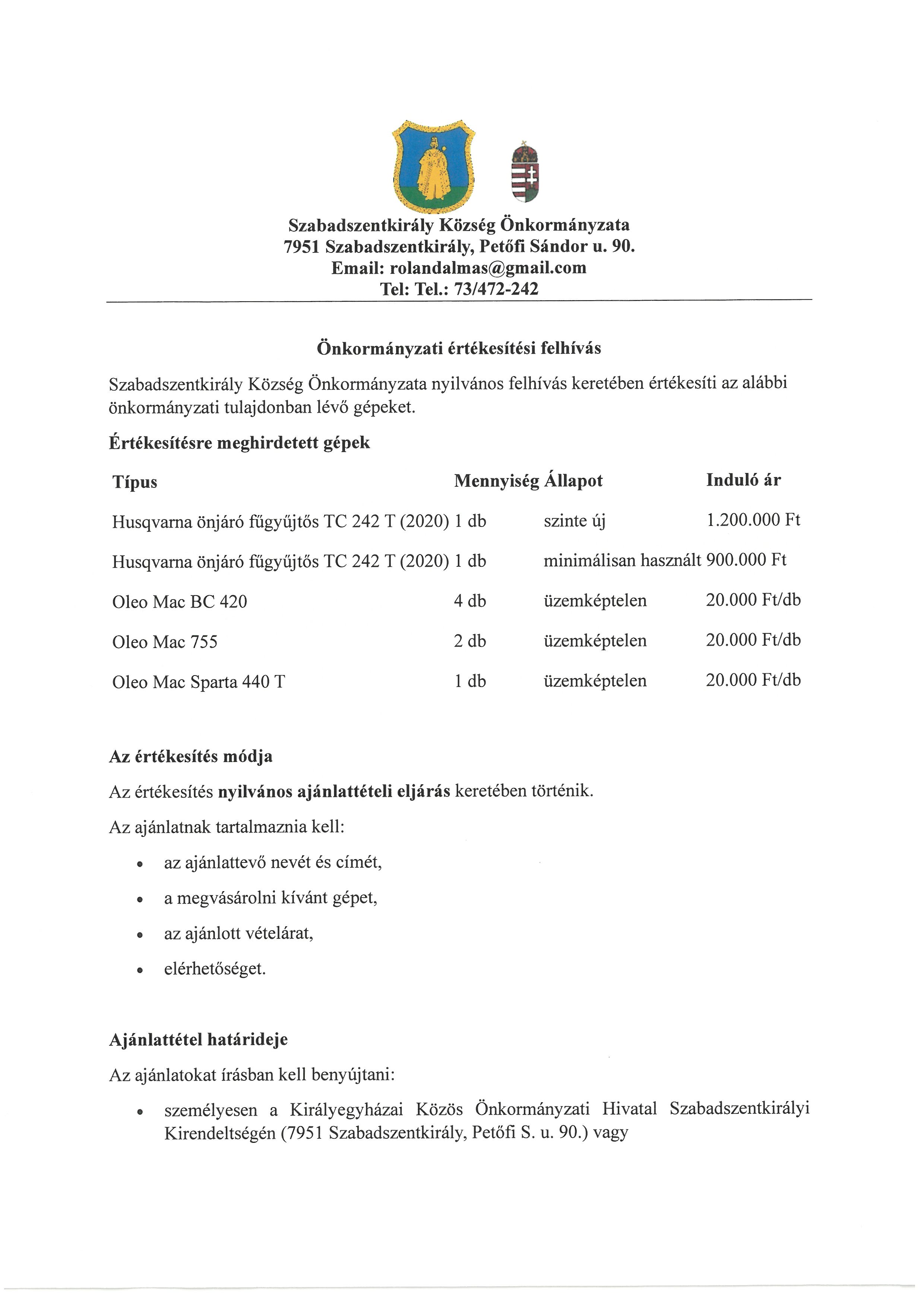 Érdeklődni Almás Roland polgármesternél lehet a 30/208-4560 telefonszámon.